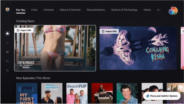 We designed a Coming Soon rail that displays trailers for upcoming shows on the Discovery+ platform.